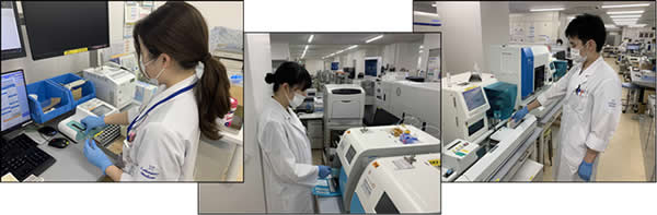 一般検査室では尿検査(定性・沈渣)や便検査(潜血・アメーバ)、穿刺液検査(細胞数・比重・関節液結晶)、迅速感染症検査(インフルエンザウイルス、RSウイルス、ロタウイルス、アデノウイルス、ヒトメタニューモウイルス、水痘・帯状疱疹ウイルス、デング熱、A群β溶血連鎖球菌、肺炎球菌、レジオネラ菌、マイコプラズマ、マラリア)、尿素呼気試験などを担当しています。