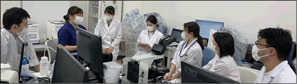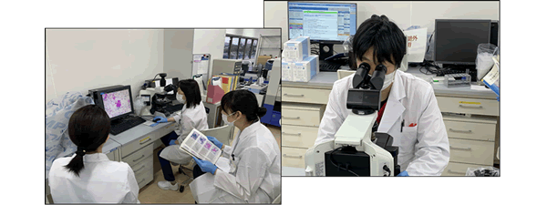 尿沈渣や穿刺液の細胞数検査では顕微鏡で細胞の判定をするため、専門的な知識と熟練が必要であり、日々研鑽の毎日です。 異常な細胞を発見した時は、医師や病理診断科、血液検査室とも連携をとり、診療に役立つ結果報告を目指しています。